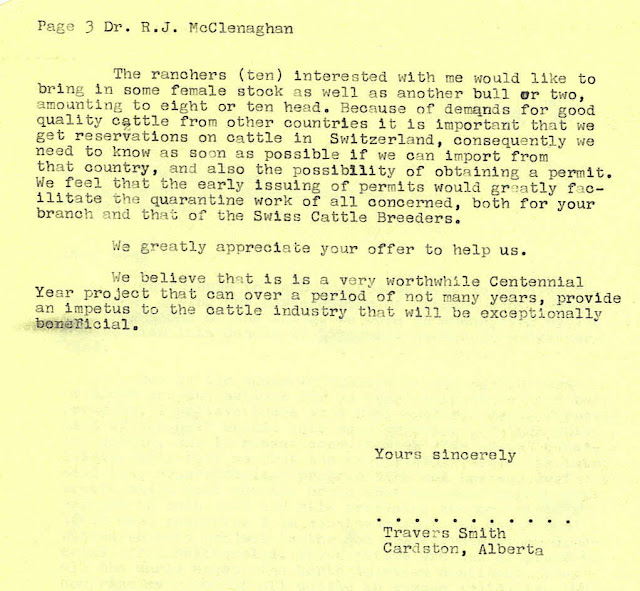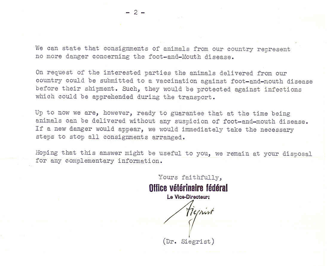 The pace of investigation, inspection, negotiating, and decision-making seemed agonizingly slow as the clock ticked toward vaccination and quarantine deadlines in Switzerland for the cattle selected for the Canadian importers. Letters, telephone calls, questions, and replies were flowing in all directions. Not all can be reproduced here, but a sample listing (January through August 1967) follows the reproduction of 3 representative letters: